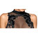 Elastic, sleeveless dress in a tight, figure-hugging cut in a noble black mix of Powernet (top) and Powerwetlook, skirt part. Above the cleavage with elegant embroidery. At the back with an extra-large neckline to the bottom. The small stand-up collar is closed with three buttons. The skirt has a small slit at the back.