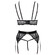 The adjustable, double, velvet straps criss-cross over the cleavage area and then turn into 4 straps at the back. The suspender belt has a velvet waistband and a decorative ring at the front. The suspender belt also has a hook fastener at the back. The 6 suspender straps can be adjusted. The matching string is completely crotchless and has a removable chain over the crotch.