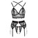 Bra, suspender belt and crotchless string from Abierta Fina made out of stretchy black lace with velvet details and rose-gold coloured accessories. The bra is longer than normal bras and has slitted cups with small hook fasteners underneath the satin bows. There is also a hook fastener at the back.